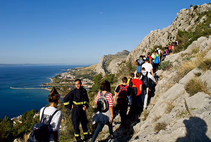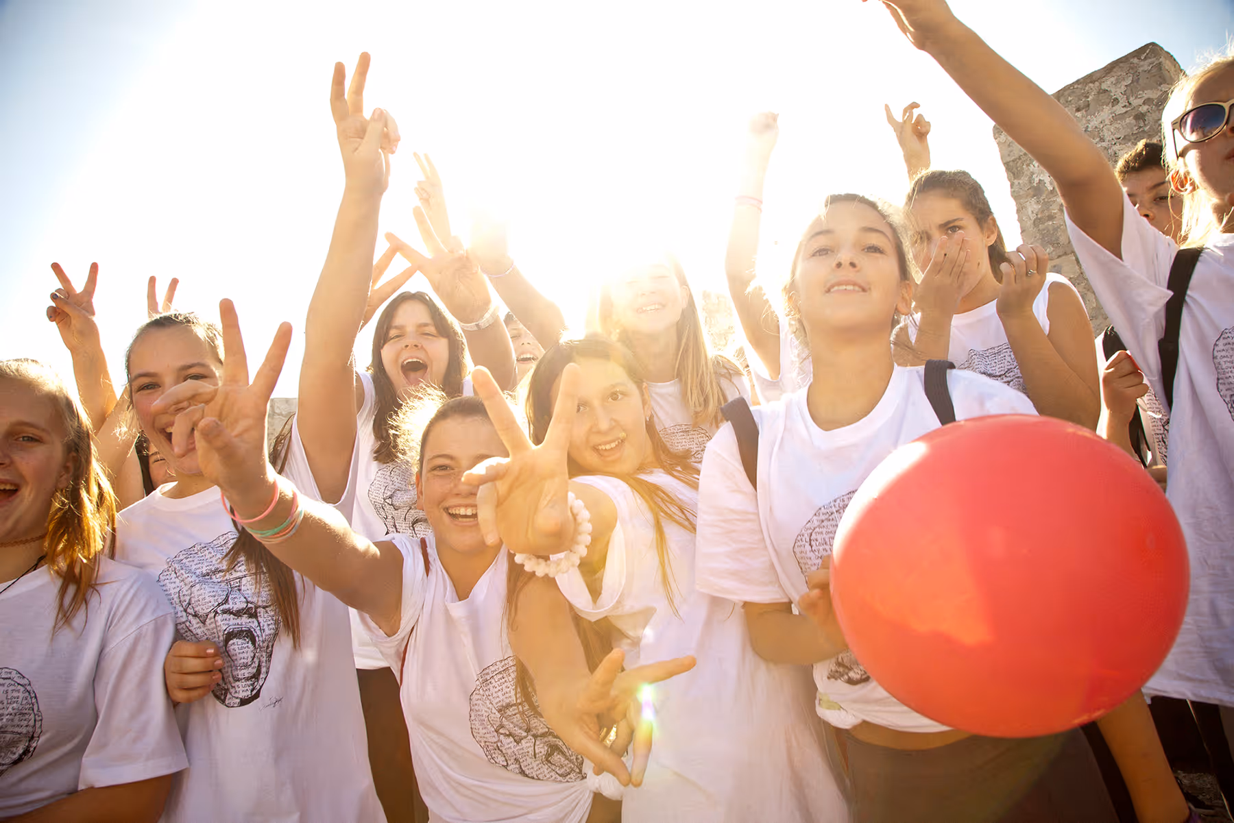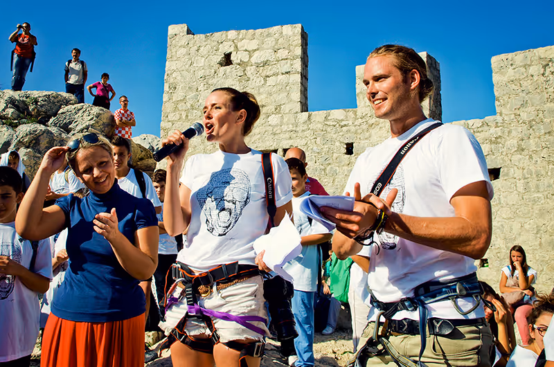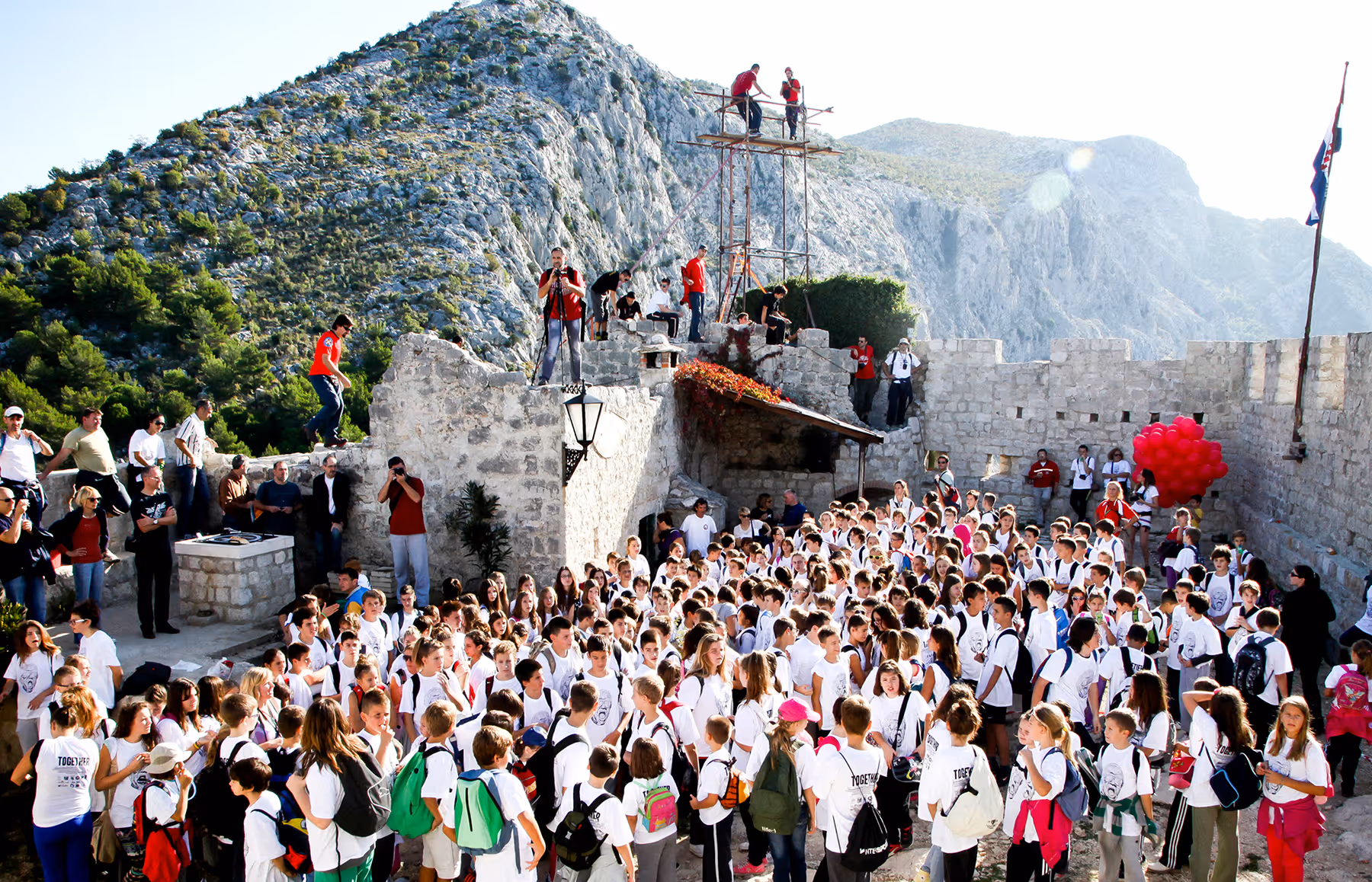Release the balloons! Hundreds of red spheres soar up into the brilliant blue from atop of a 15th Century pirate fort overlooking the Adriatic Sea in Omis, Croatia. The mountainous Croatian landscape proved a challenge for finding the perfect location to stage the photograph, but Fortica proved an inspired choice. Assisted by local fire, police, war veterans and mountain rescue personnel, 330 children walked up the side of a mountain in October 2013 to create one of the most breathtaking images yet. Since taking a crane to the top was impossible, a scaffolding tower had to be constructed on site at the edge of the fort, teetering over a 100-meter drop, and all that equipment had to be carried up by hand. However, the spirit of cooperation for a great cause shone through with volunteers from all over the community coming together to assist Ashley and Filip on this leg of their worldwide journey. Setting the balloons free proved an inspired finish to a remarkable day, sending aloft the signal of hope that is the spirit of the ABC Charity.